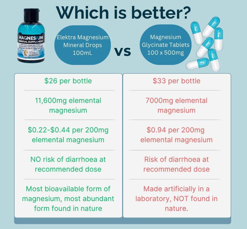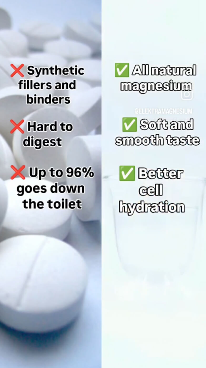 We have not evolved to digest tablets and powders which are a super high concentration that you would NEVER find in nature, travelling through the gut. Not only does your digestive system have to pull apart the fillers and binders, but if you have taken a chelated magnesium like glycinate, citrate, etc, then the body has to separate the glycine from the magnesium, then find a chloride in the body to bind to the magnesium before it can even be taken up by the tissue cells! This is a long process which most magnesium will be wasted down the toilet before it has had a chance to absorb.