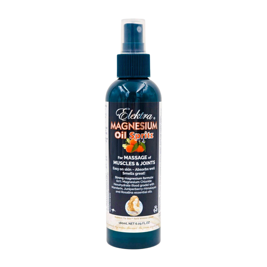 Elektra Magnesium Oil Spritz (strong formula) delivers potent high-concentration magnesium chloride with a pleasant mandarin essential oil fragrance. It’s ideal for massage to relax tight muscles and joints, offering smooth glide and fast absorption—without the sticky or irritating residue often experienced with pure magnesium oil.
